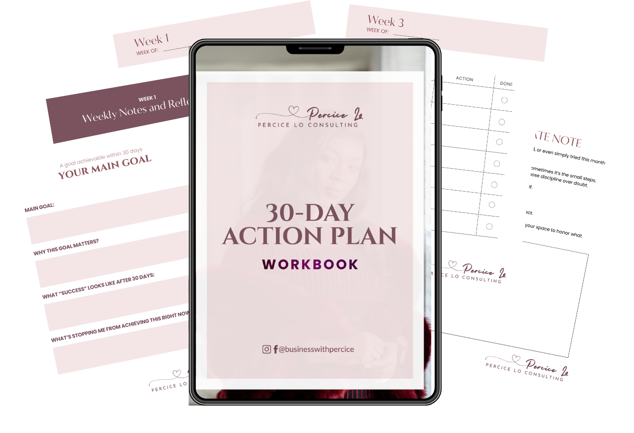 The 30-Day Action Plan Workbook is your personal accountability partner — designed to help you start, show up, and stay consistent.